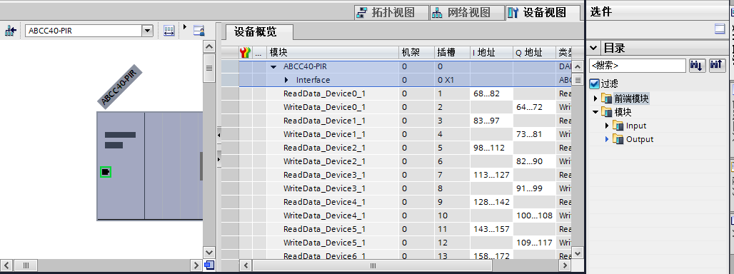 雙擊虛擬總線控制器設備,打開“設備視圖”,在右側的目錄中打開Input子目錄,添加總線控制器CAN網絡下所有受控從站及網絡分組的上行數據塊。添加完畢后,打開Output子目錄,添加總線控制器CAN網絡下所有受控從站及網絡分組的下行數據塊。雙擊所選數據塊,即可完成添加。